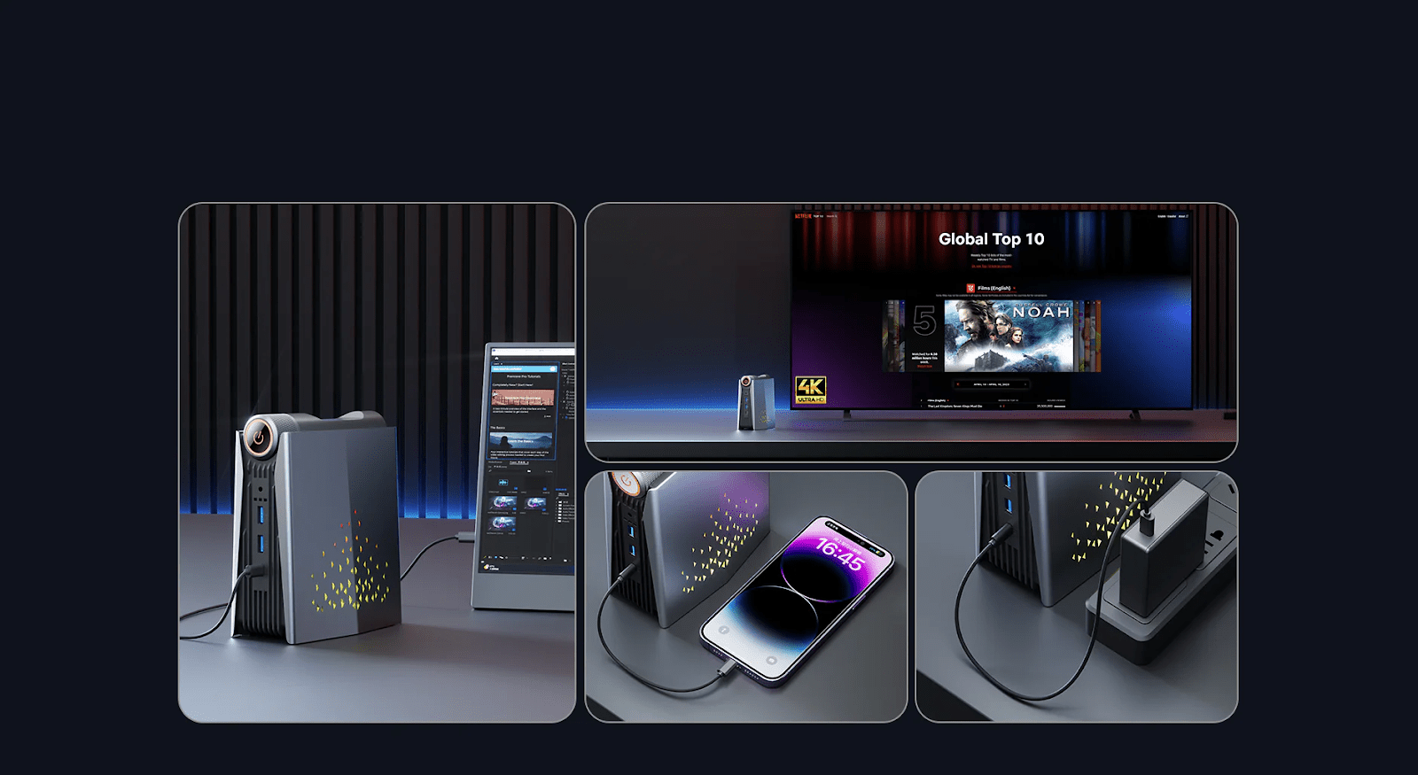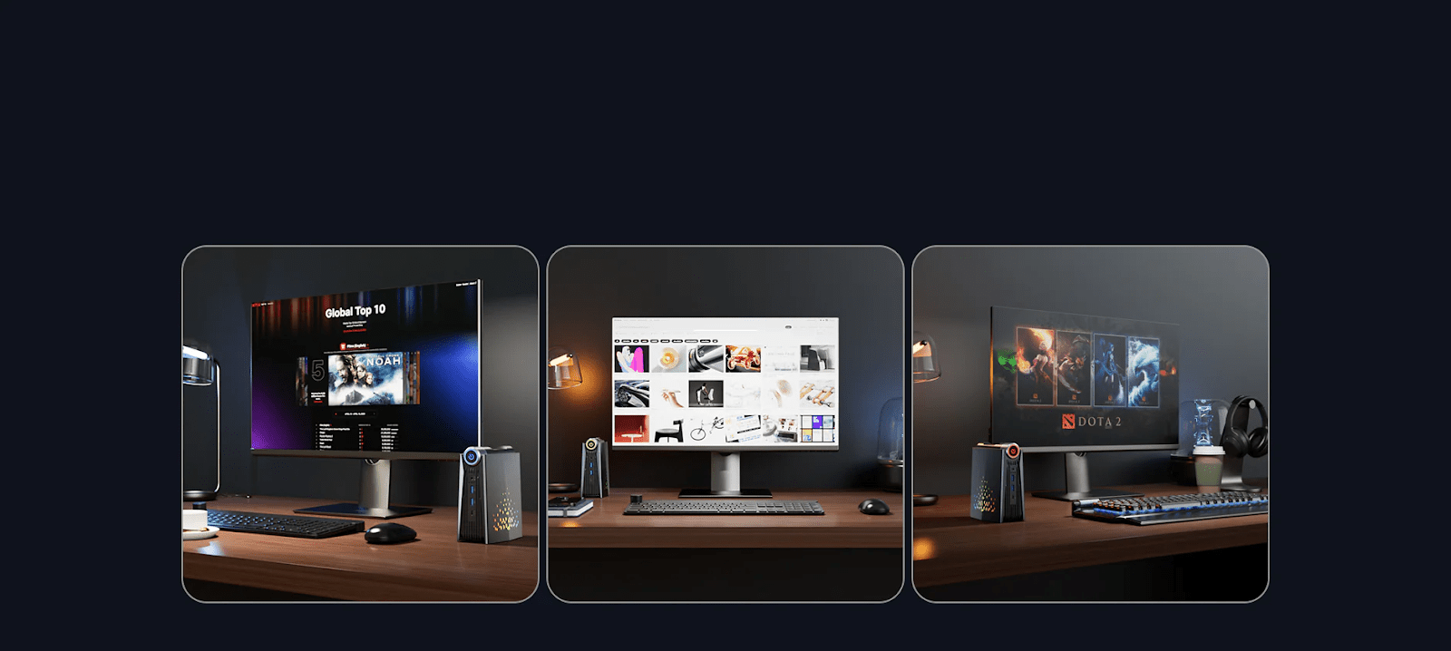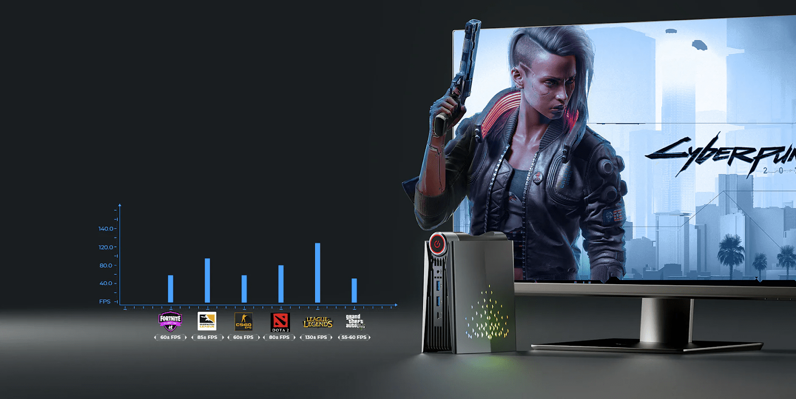 Мини-игровой ПК AMR5 предлагает три различных режима освещения (дыхание/цикл/радуга) по выбору, вы можете выбрать любимый эффект в соответствии со своим настроением. Этот мини-ПК оснащен модулем охлаждения, изготовленным из смеси современных медных сплавов для эффективного рассеивания тепла. Это поддерживается сверхбыстрым охлаждающим вентилятором. Вместе вы останетесь прохладными даже во время самых интенсивных игровых сессий!